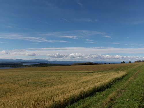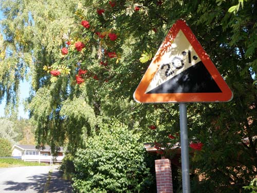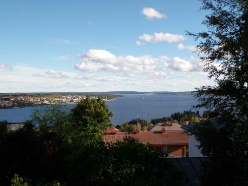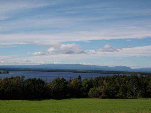 Vid Östersunds turistbyrå stod min geobike och väntade. Den hade få likheter med de cyklar som hyrdes i Sölvesborg, denna gång var det mer växlar än man kunde räkna på fordonet, riktigt grova hjul dessutom. Jag rullade nedför backarna mot vattnet och upptäckte snart att bromsarna nog inte var riktigt i toppskick, ett vanligt problem på hyrcyklar, det blev till att se sig för innan turen gick nedför brantare backar! Jag hade på långt håll sett bron över till ön, men den visade sig bara var för bilar, inga fotgängare och inga cyklister angav skyltarna. Jag misstänkte givetvis att det fanns en alternativ väg, men skylten som visade på var GC-väg skulle finnas pekade åt vänster, sedan ingen mer skylt. Det kanske inte behövdes någon skyltning enligt principen ”alla vet ju var bron är”. Efter detaljgranskning av min karta hittade jag en tunn linje över vattnet och styrde cykeln dit, där plockades en burk, sedan en halvvägs över och sedan var jag över på Frösön.