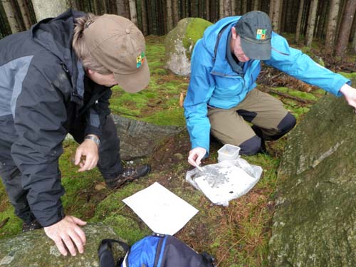 Vi tog därefter en tur runt den lilla sjön och plockade några burkar, här fanns även burk som Ingabo och jag tagit sedan tidigare, så vi fick titta på medan övriga loggade. En av de mer udda loggböcker jag sett påträffades i cachen ”Stenrika Cachen”, loggboken bestod av sten!