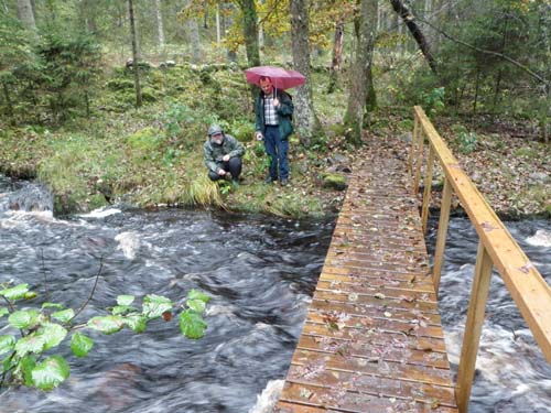 En sista vandring skulle vi hinna med utmed ”Hallabäcksrundan” som bjöd på varierande utmaningar. Vid en cache som låg utanför själva ”rundan” hindrades vi av mängder av mugglare, därefter hade vi ett par irriterande DNF:er så framgången utmed turen var lite blandad. Dessutom öppnade någon kranen uppe bland molnen och släppte loss ett ordentligt skyfall!