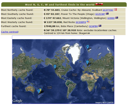 Det enda aviga i bilden tycker jag är att mest östligaste cachen hamnar till väster om den västligaste… Ingen stor sak men man hade önskat kartan lite åt ”vänster” så Asien, Australien och Nya Zeeland hamnade till höger i bild… Hade varit mumma… aldrig får man vara riktigt glad 🙂