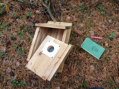 Med hjälp av lite grövre ståltråd lyckades jag binda ihop holken och hänga upp den i träden. Förhoppningsvis håller denna lösning en tid, bättre än att den ligger på marken. Glad blir man givetvis inte över denna meningslösa vandalism. Det förefaller osannolikt att geocachare ligger bakom förstörelsen, åtminstone hoppas jag att det inte är några inom vår hobby!