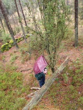 Peg hade med ett paraply, det kom till användning som tak vid loggningen.