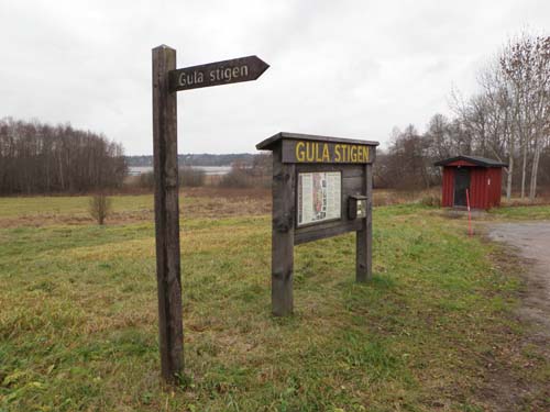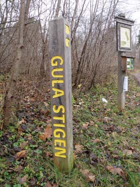 Där blev det ytterligare några cacher innan jag insåg att det var hög tid att bege sig mot starten av Gula stigen och dess powertrail innan jag förbrukat för mycket av dagsljuset. Vägen dit gick genom ett villaområde som gav ganska god utdelning när det gäller burkar, bland annat några ”hemma hos” burkar men ingen ägare uppenbarade sig när jag sökte igenom området utanför deras hem. När starten för stigen låg framför mig hade jag redan avverkat 14,51 kilometer till fots denna dag och 17 burkar var loggade. Gula stigen är en mycket trevlig trail som sträcker sig från Skarholmen upp till Kronåsen och Studenternas Idrottsplats, en sträcka på omkring 10 kilometer. Trailen har 20 traditionella, en extra startcache och fem bonuscacher.