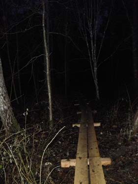 Vid nummer 13 i serien, vid en bro, fick jag leta oväntat länge. Typiskt att det var ett ”olyckstal” som ställde till med problem! Men slutligen letade jag igen där jag redan letat och då kom burken fram. När jag närmade mig nummer 15 gick solen ned och det blev snabbt allt mörkare. Lyckligtvis var inte burkarna speciellt svåra så jag kunde hålla tempot uppe, även om man fick gå lite försiktigare på den leriga stigen.