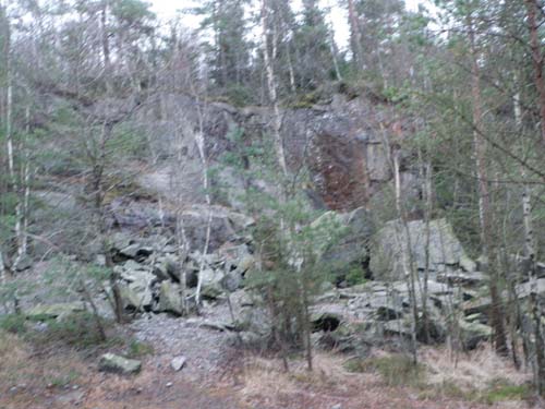 En bit fram kunde jag nu följa cykelbanan, den före detta järnvägsvallen, innan det var dags att hitta en väg mellan husen in mot ”Stenbrottet”, som väntat fanns det en rejäl stig in i området – sen var det bara att börja leta. Invid den höga bergskanten drev nollan omkring något men ganska snabbt var en misstänkt plats lokaliserad. Värre var det att få ut burken, det krävdes en insats av tången på multiverktyget för att lösa problemet.