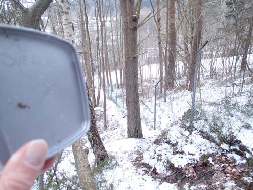 Klass Pluto på Västerbergsskolan har lagt ut en serie om fyra cacher på temat Sverige, den första cachen bär också landets namn. Efter en kringgående rörelse ut i villaområdet för att undgå det inhägnade militära området gick jag rakt mot burken uppe i bergssluttningen. Fotsteg i snön vittnade om Moonmattes besök under gårdagen!