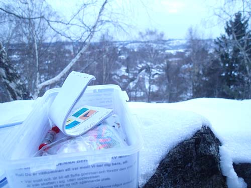 Turen gick med cachinglinje 5 till Korsvägen och därifrån en rask promenad uppför Eklandagatan – som erbjuder en ganska ordentlig stigning – fram till dagens första mål ”Guldhedsbergen” som var stängd under förra helgens besök i dessa trakter. Nu var den dock på plats igen och jag kunde bara följa i tidigare burkjägares spår och logga burken – det är ju nästan fusk!