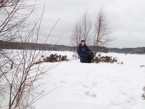 När jag hade knappt tio meter kvar till burken fick jag se att någon satt på en klippavsats några meter upp, en man med ett stort gevär! Det var inte riktigt vad jag väntade mig, men jägaren visade sig vara trevlig och på jakt efter skabbrävar. Jag förklarade lite om geocaching för honom, det var säkrast då jag snart skulle bli tvungen att bete mig lite märkligt och stoppa huvudet i en enbuske! Burkens gömställe var dock utom jägarens sikt- (och skott-) linje så jag kunde logga ostört och i hemlighet. Under tiden hade han begett sig av över isen på tjärnen och jag kunde återvända upp mot bebyggelsen för att påbörja vandringen tillbaka till cachingbasen.