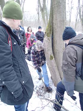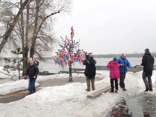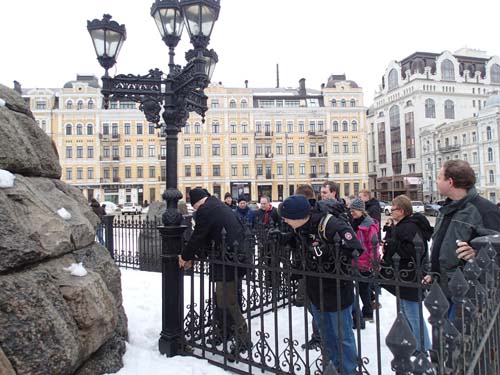 När bussen rullat lite närmare centrum började det dyka upp lockande symboler på våra gps:er, alla var nu riktigt sugna på en första logg i Ukraina, men det skulle visa sig lättare att drömma om än att förverkliga! När vi stannade vid klostret St. Michaels skulle guiden få erfara att detta inte var en normal turistgrupp som snällt följde hennes ledning genom gatorna! Hon var på väg in mot klostret, hela gruppen däremot avvek 30 meter mot ”St. Michael’s Monastery and the Holodomor Monument”! Hon såg förfärad ut! Tyvärr var detta en marknära cache, begravd under en rejäl snövall. Vi var därför tvungna att ge upp och följa med in i den religiösa anläggningen. Inne i kyrkan fick man inte tala, men när vår grupp klivit in genom dörrarna hördes mängder av pip, pip, pip – ingen hade någon mottagning. Man kan alltså säga att det var en plats helt utan kontakt med de högre makterna!