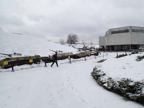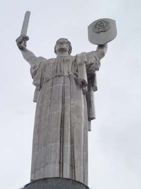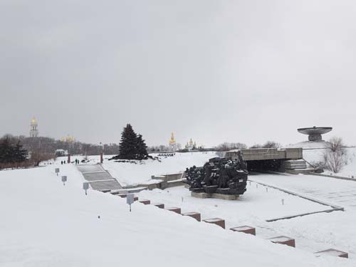 Allt roligt har ett slut, brukar det heta, så även denna resa. Större delen av måndagen kunde dock ägnas åt burkjakt i Kiev. Bussen till flygplatsen skulle avgå först 16.30, vi hade därmed ganska många timmar till i staden. Efter frukost gav vi oss ut i små grupper och spreds över stadens gator. Jämfört med tidigare dagar var det kallt, flera minusgrader med hård vind och tidvis snöfall! Det hindrar givetvis inte inbitna jägare så vi gav oss av mot den virtuella cachen ”WWII”. Ett stort monument över den Sovjetiska segern över de tyska angriparna i det stora fosterländska kriget – alltså andra världskriget.