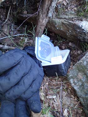 Det var klart och soligt även denna förmiddag, men ovanligt kallt för årstiden med 6 minusgrader. I god Hallénfart gav jag mig av ut i Delsjöskogen, det blev en liten extra slinga för att få lite mer motion. När jag kom nära Edsvikens strand vek jag av in i skogen och uppför berget. Sedan tog jag mig över en mindre mosse, som idag var frusen så varken vatten, fästingar eller huggormar besvärade mig – annars är sådant vanligt på platsen! När jag kom upp på berget hoppade min gps av och an, 20 meter, 30 meter 15 meter, 50 meter – 0 meter… Efter lite snurrande lyckades jag dock få maskinen att lugna ned sig, antar att den var upphetsad av att var igång igen efter flera dagars djup dvala. Slutligen var även jag fokuserad nog att faktiskt se att där låg en sten, och bakom den en plastburk.