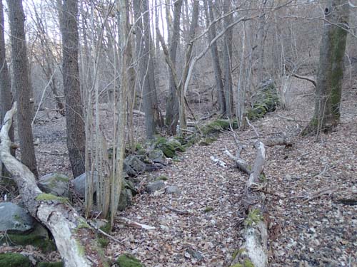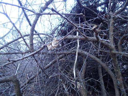 Naturligtvis kom jag på fel sida av bäcken, då den inte var frusen utan porlade friskt var det bara till att vada över för att kunna närma mig nollpunkten. Taggiga buskar väntade de sista stegen mot cachen.
