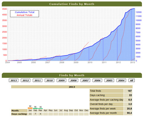 Ett diagram som kan vara spännande att titta på är den kumulativa ökningen av burkar över åren. Samt antalet hittade cacher per månad under innevarande år.