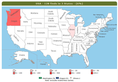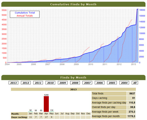 Under hela 2012 loggade jag 4 534 cacher, det överträffades på endast lite över två veckor i västra USA. Allt annat under året kommer knappt att bli synligt och den kumulativa ansamlingen av burkar har fått ett minst sagt udda utseende!