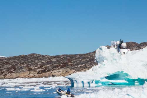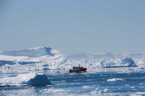 Ilulissat betyder helt enkelt ”flera isberg, eller många isberg”, ett passande namn på denna plats! MS Fram gick långsamt fram mellan isbergen och bröt sig igenom några isbarriärer innan ankaret kastades en bit utanför den lilla staden Ilulissat. Dagen skulle börja med en tur på den minst sagt spektakulära isfjorden, som finns med på UNESCOs världsarvslista. En glaciär, tre gånger så stor som Danmark, kalvar ut i fjorden. Det är mycket stora isberg som sedan driver några kilometer innan de stoppas av grundare vatten, endast 200-300 meter djupt, där får giganterna som har ett djupgående på bortåt 600 meter vänta tills de brutits sönder eller smält något, därefter kan de fortsätta ut på haven och skrämma sjöfarten!