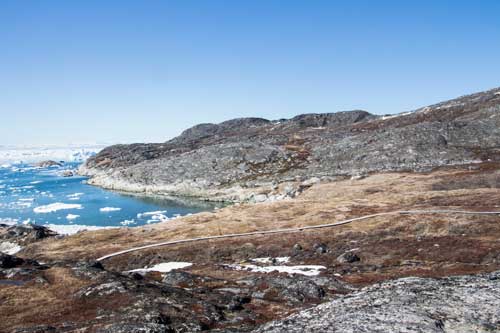 Vägen ut mot isfjorden går på en träspång som är ditlagd för att skona det känsliga växtlivet på de våta ängarna i naturskyddsområdet.