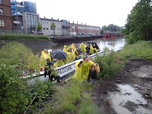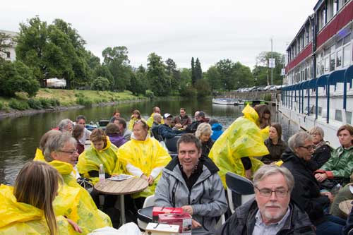 Klockan 16 på onsdag eftermiddag lämnade pråmen – det vill säga paddan – kajen vid Kungsportsplatsen efter att vi lyssnat på ett föredrag om stadsplanering. Turen gick via Stora Hamnkanalen och Göta älv in i Säveån. Det var då regnet började på allvar och åtskilliga klädde ut sig till kycklingar (dock inte Hallén som givetvis var förberedd med egna regntåliga kläder och regntålig kamera). Regnet tilltog allt mer och vatten sprutade ut ur dagvattenledningarna ut i Säveån, så långt inget onormalt…