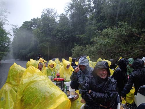 Slutligen fick vi kliva av vid strandkanten, rakt ut i lera och grus, kanske mindre kul för några av kvinnorna med högklackat och några män med ljusa kostymer under de gula kycklingdräkterna.