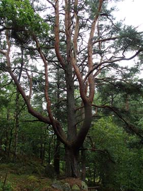 Riddaren Ture Eriksson ’Tre rosor’ levde i Mellby på 1300-talet. 1392 skänkte han ett antal kvarnar Vid Besebäcken till Vadstena kloster.” (Källa: Gatunamn och platser i Partille, Nättidningen GLIMTEN). Men jag får uttrycka viss skepsis till att riddaren skulle ha varit bosatt i Mellby, gården. Jordbruk och kvarnar i trakten ingick i ett större gods och riddare Ture bör ha haft sitt hem på en sätesgård. Det är inte riktigt rätt plats att gå in på djupet i denna fråga här på geocachingbloggen så jag återvänder därför till dagens vandring. Efter att jag passerat skylten på bilden ovan gick det rejält uppför. Först passerades en gammal bro över bäcken, men den ledde upp till ett hus, sedan kom en bro till och den var möjlig att gå över utan att gå in på någon villa tomt. Därefter var det bara att fortsätta uppför en stund till innan jag kom fram till en mycket imponerande tall, den har nog vuxit där ”några år”!