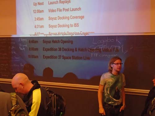 Uppskjutningen var inte uppskjuten så vi fick vår underhållning på den stora duken och kunde minut för minut följa förberedelser och avfärd för astronauten Rick Mastracchio. Mellan händelserna var det givetvis mycket burkprat i lokalen!