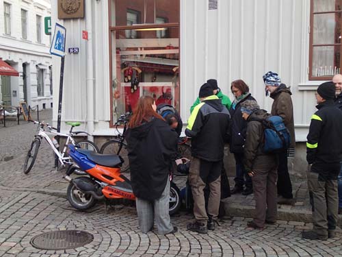 När klockan närmade sig 11 kom det geocachare ut ur alla vrår för att fira Julevent. Loggboken fylldes av signaturer och det var en härlig förväntansfull stämning.När klockan slog elva kunde jag annonsera att julkalendern som vann överlägset var Albert och Herberts jul, det var ren utklassning! Detta väckte jubel hos de församlade burkletarna. Därefter gav jag en kort presentation av förorten Haga och dess historia, men jag höll mig kort då det inte är den bästa platsen att föreläsa på, mitt på Haga Nygata!