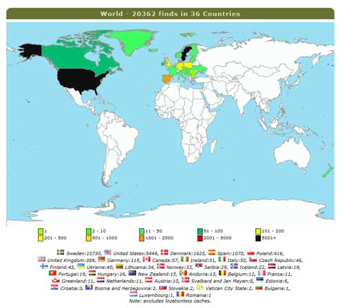 Världskartan har fyllt med lite mer färg under det senaste året. Sju nya länder har ”erövrats” och USA har fått samma färg som Sverige, endast förärat länder där jag har över 5 000 hittade burkar! Det har sannerligen varit ett händelserikt år.