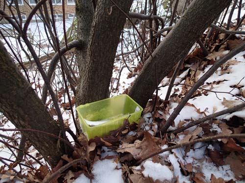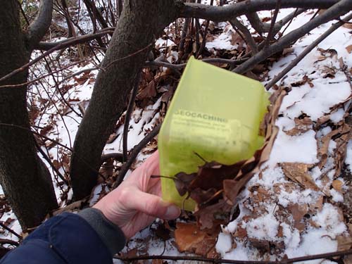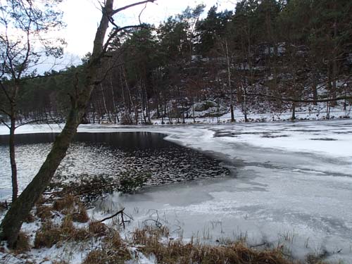 Min vandring fortsatte nu mot ”Tolered #3 Bänkad & skolad”, en burk med hög terrängangivelse men det visade sig inte vara så farligt med den saken. Burken hittades liggande öppet på marken och den hade inte någon lock så allt var fruset, det gick dock att se delar av innehållet som bekräftade att det var en cache jag hittat! Här fick det bli en fotologg då det inte var meningsfullt att lägga ny loggremsa i en burk utan lock.