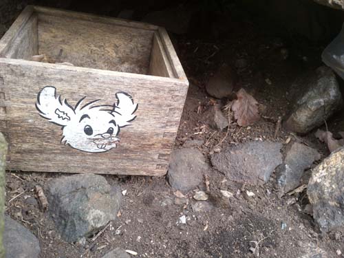 Det var några kilometer till fots från arbetet bort mot dagens första burk ”Supergömman”. Där har jag varit en gång tidigare och letat, men då visade min gps mot en plats mycket högre upp och då hittade jag inte något, några hundmugglare var också besvärliga kan man läsa i min DNF logg från den 2:a juli 2013. Inför dagens tur hade jag granskat denna burk extra och tittat på både höjdlinjer och flygfoton för att bättre kunna avgöra var den låg. Min slutsats blev att det var bäst att komma från bergets fot och gå upp. Det visade sig vara en mycket bra strategi! Det var inte många meter upp från den lilla stigen till en trälåda med en glad kanin på, men lådan är inte cachen, den ligger något till höger, man kan ana den på bilden ovan. Nog var jag mycket nöjd med att få rensat bort detta ”superproblem” från min karta. Det var nästan med glädjeskutt (har jag fått kaninsjukan…) som jag förflyttade mig upp mot nästa höjd och cachen ”Gråbergets Gamla vattenreservoaren”. En imponerande plats, det är verkligen stor kontrast mellan den gamla och den nya anläggningen!