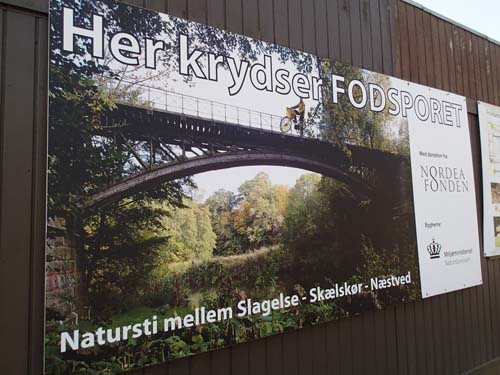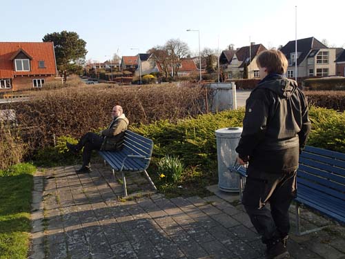 Denna serie av cacher består av 50 burkar plus några extra invid spåret. Därefter följer en extra del med tribut-cacher som berättar om olika danska geocachare. Vi delade upp det hela i två delar och återvände till bilen för att flytta den till nästa lägliga parkering. Förflyttningarna gick lyckligtvis snabbt på denna långa, platta och raka väg! När vi förberedde oss inför att gå del två av banvallen kom polisen…. De hade fått rapporter om att en svensk bil kört runt i området! Detta skulle undersökas då det tydligen varit problem med folk från andra delar av vår kontinent som kört runt med (stulna?) fordon från Sverige och ägnat sig åt mindre trevliga aktiviteter på den danska landsbygden. Men polisen avskrev alla misstankar mot oss näst intill omedelbart. Jag misstänker att de friluftsklädda geocacharna inte såg ut att höra hemma i den kategori brottslingar som eftersöktes vid detta tillfälle. Vi kunde alltså utan problem fortsätta vår färd.