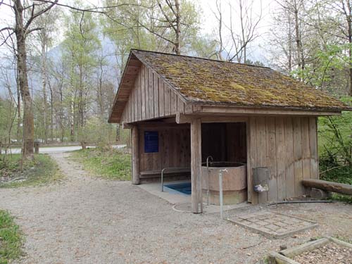 Den låg på en hylla ovanför ett litet hus med en bassäng, tydligen avsett till fotbad, märklig liten anläggning. Något fotbad behövde jag inte utan fortsatte ett kort stycke till furstendömets första och enda TB-hotell ”1. TB und Coin Hotel im Fürstentum Liechtenstein”.