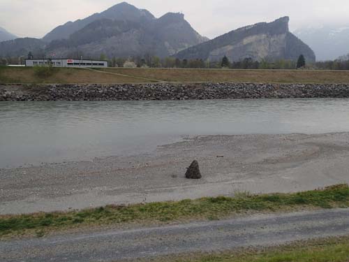 Efter en kortare promenad nådde jag fram till den mäktiga floden Rehn. Utmed dess sidor löpte massiva vallar och på toppen av dessa gick en gång och cykelväg. I vallens sidor låg det på den Schweiziska sidan betongbunkrar med jämna mellanrum, gränsen verkade var ordentligt befäst. Vid den andra bunkern jag kom fram till skulle cachen ”SumiFimiLomi_5” finnas, men jag hade inte något större hopp om denna burk då tidigare besökare ägnat mycket tid åt att finna den. Jag letade i dryga tio minuter, sedan valde jag att fortsätta min vandring, jag hade ju en gräns lite längre fram.