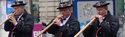 När jag åter närmade mig cachen vid biljettmaskinen ”BlackBox Micro Paradeplatz Zuerich” fick jag dagens första överraskning. Omedelbart intill gömman befann sig tre män i lustiga hattar, samtliga försedda med långa näverlurar som de använde för att framkalla ett väldigt tutande. Kan detta var sant, tänkte jag, det är nog en (mar)dröm! Männen i hattarna visade inga tecken på att ge sig iväg, de fick istället sällskap av annat löst mugglarfolk, inklusive poliser. Det var bara att inse att en logg på denna cache skulle förbli en dröm.