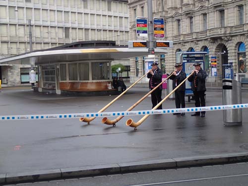 När jag åter närmade mig cachen vid biljettmaskinen ”BlackBox Micro Paradeplatz Zuerich” fick jag dagens första överraskning. Omedelbart intill gömman befann sig tre män i lustiga hattar, samtliga försedda med långa näverlurar som de använde för att framkalla ett väldigt tutande. Kan detta var sant, tänkte jag, det är nog en (mar)dröm! Männen i hattarna visade inga tecken på att ge sig iväg, de fick istället sällskap av annat löst mugglarfolk, inklusive poliser. Det var bara att inse att en logg på denna cache skulle förbli en dröm.