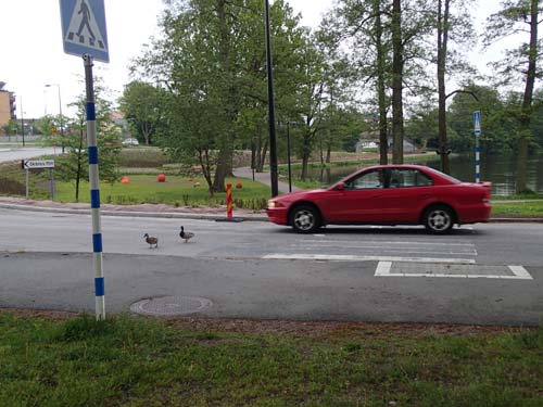 När vi var mätta och nöjda på sociala aktiviteter så återvände trion till Höör för att börja med kvällens burkjakt. Det blev först ett försök invid ett stort träd utanför vårt hotell, men där lyckades vi inte denna kväll. Däremot underhölls vi av ett par gräsänder som vankade av och an på övergångsstället!