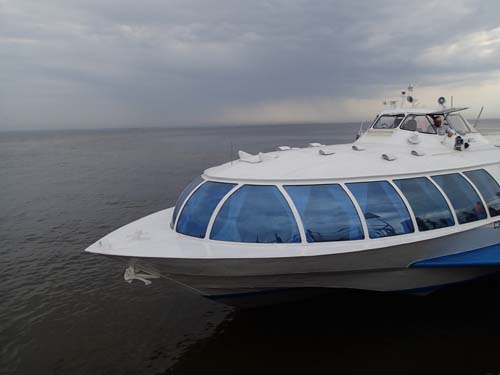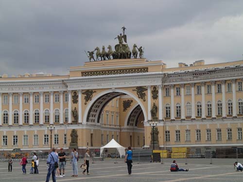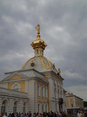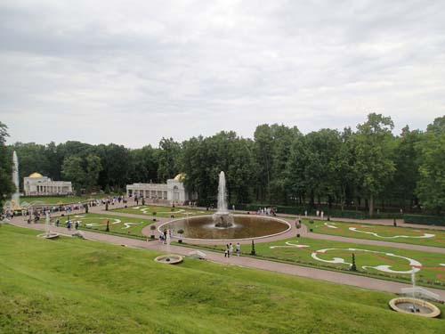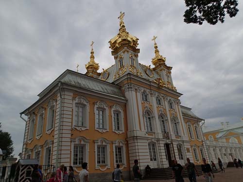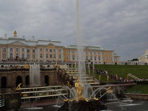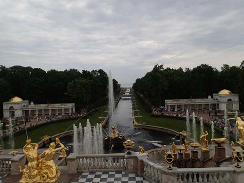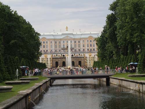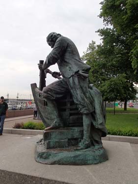 Frukosten på hotellet serverades först en bra bit in på förmiddagen, vid klockan 8, så det blev inte någon tidig avfärd från hotellet inte. Men dagens första mål var att ta en båt ut till det stora sommarpalatset Peterhof och dessa började ändå inte gå förrän vid 9.30-tiden så den sena frukosten (nästan lunch) gjorde inte så mycket. Under vår korta vandring mot kajen utanför Vinterpalatset passerade vi åter igen en mängd brudar men inte en enda påse chips. Dessutom gick vi förbi en staty av tsar Peter som byggde fartyg.