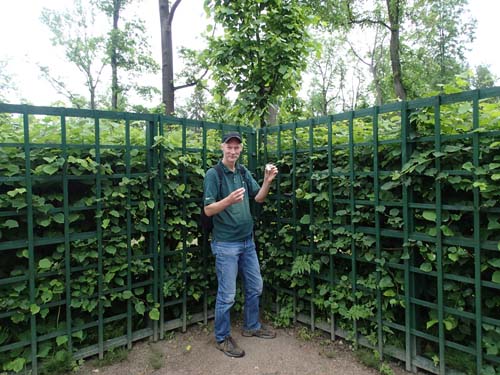 Var syftet med vårt besök enbart att titta på trädgård och palats? Nej, icke så! Vi hade nämligen en liten burk som hägrade i den bortre delen av trädgården, ”Peterhof: Lower Gardens – Петергоф: Нижний парк”. Det var ungefär en kilometer att gå till cachen från mitten av trädgården, vilket säger något om dess storlek! Det var egentligen bara de mest centrala delarna av anläggningen som mugglarskarorna besökte. Kring cachen var det mycket fridfullt och vi kunde söka av området ostörda. Det dröjde inte många minuter innan hebb gav till ett glatt utrop och burken låg framför oss.