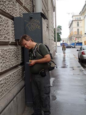 Efter några kilometers promenad nådde vi Vid ”German Church” fanns till vår stora glädje en burk! Ytterligare en bit bort fanns ”Bank Bridge – Банковский мост” som enligt tidigare loggar var borta men alla hade ändå loggat den med fotologg! Vi kunde ju inte vara sämre, dessutom satte vi dit en ny nano på den mycket uppenbara platsen. När den nya nanon utplacerades lade hebb ifrån sig paraply och gps bakom sig på stenfundamentet till bron, inte så bra i denna mugglartäta miljö. Då kom en ryss fram och frågade om vi talade engelska…. han informerade om att här kunde vem som helst plocka med sig en pryl – detta är RYSSLAND – sa han och drog iväg över bron!