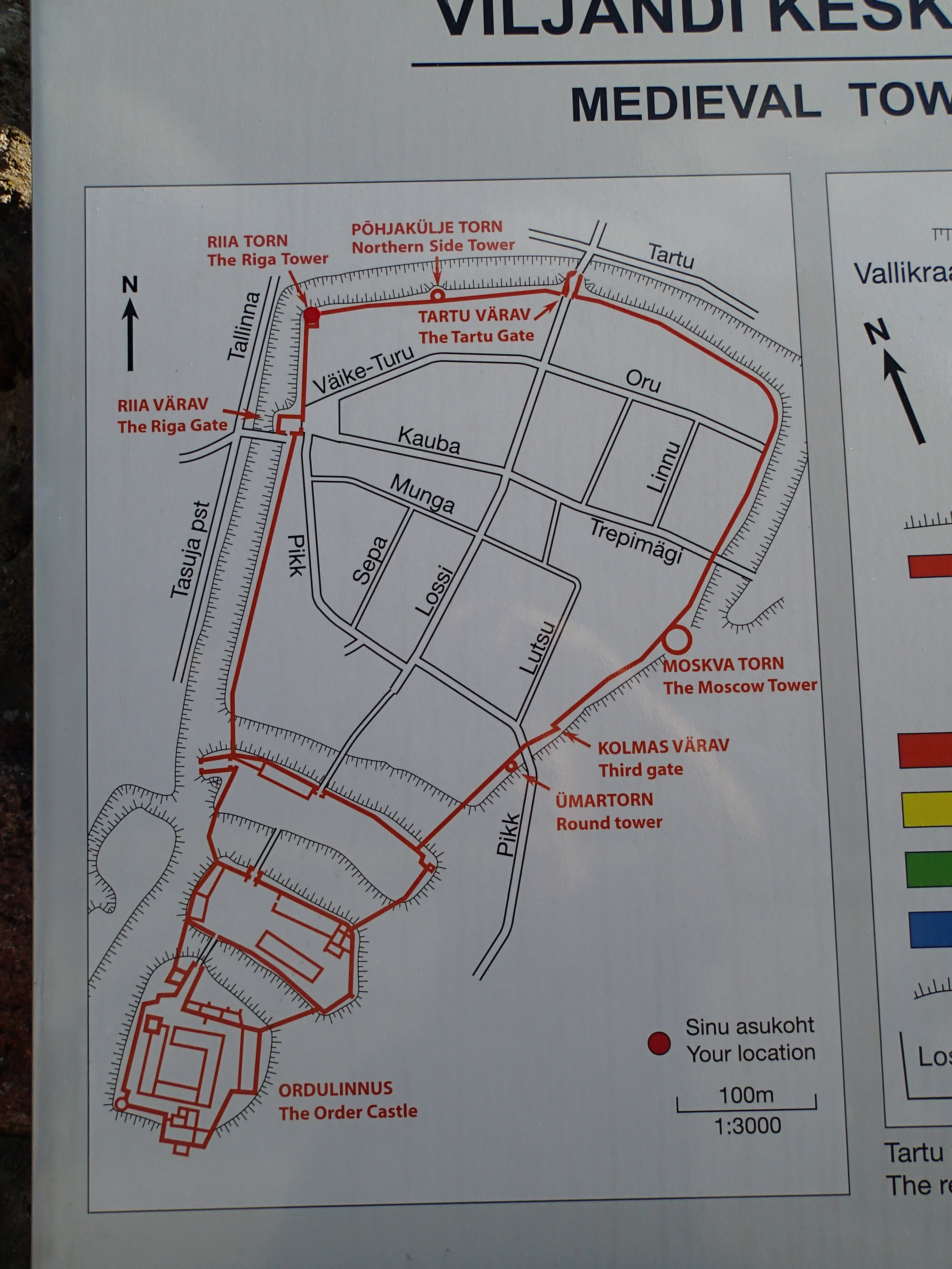 Staden Viljandi byggdes 1260-1300 och omfattade hela 10,2 hektar. Den var omgärdad av en mur som var 3-5 meter hög och försedd med fyra torn och tre portar. Utanför muren låg de väl tilltagna vallgravarna som var upp till 30 meter breda och hade ett djup på omkring 7 meter. Idag är vallgraven torrlagd men under medeltiden var den vattenfylld. Stadsmuren ser man inte mycket av då det mesta förstördes under krigen från och med 1500-talet och därefter togs stenen till bygget av hus i staden.