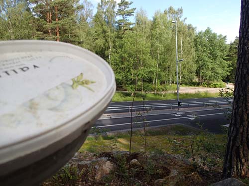 De första timmarna under förmiddagen denna söndag var det lugnt och stilla i omgivningen, det var bara att kliva fram genom den täta grönskan för att kontrollera cachen. In med handen i hålet och där kände jag omedelbart den bekanta kontakten med ett PET rör, allt var alltså som det skall, burken var på plats.