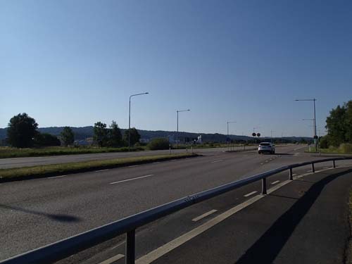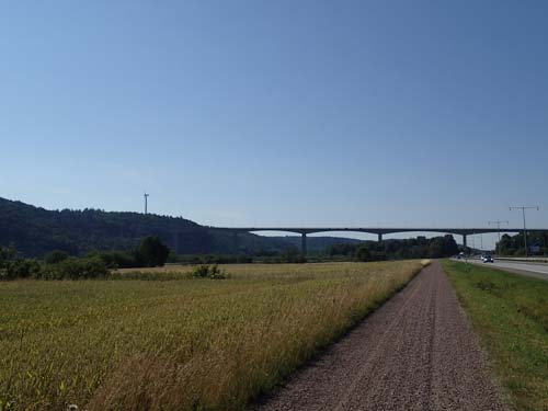 Ingen har tänkt på behovet av att korsa denna väg, GC-banan måste här ha planerats av en mugglare då den vek av åt helt fel håll. Men ett litet staket hindrar inte Hallén, ett kort kliv så var jag över och korsade vägen som denna semesterförmiddag var glest trafikerad. Därefter var jag inne vid en liten grusväg. Den går utmed motorvägen ganska många kilometer och har sedan några månader blivit berikad med en lång serie cacher.