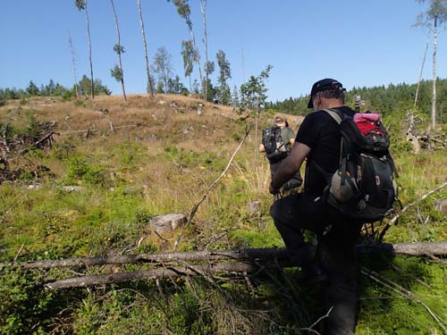 Det fanns som sagt nästan inga stigar i området, men det var gott om små mossar och ännu mer gott om kalhyggen och områden där markägaren röjt sly och låtit allt ligga kvar på marken i gigantiska områden som kan liknas vid plockepinn! Det tog på krafterna att ta sig fram över dessa områden samtidigt som temperaturen låg på väl över 30 grader när vi gick i solen.