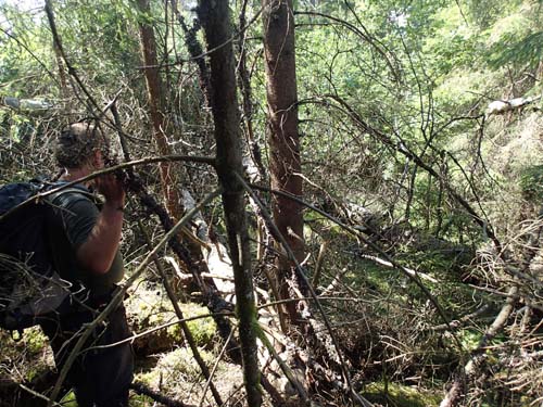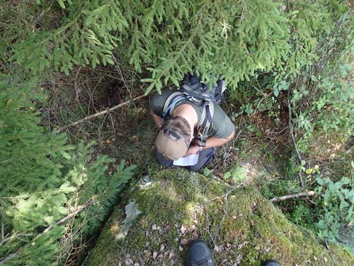 Efter laxtrappan blev terräng och plockepinn-skogen om möjligt än värre. Vi försökte hitta den optimala vägen mellan de burkar som låg nära sjön och de som låg uppe på höjderna, men vi var väl inte alltid så framgångsrika med att hitta en bra ”väg”.