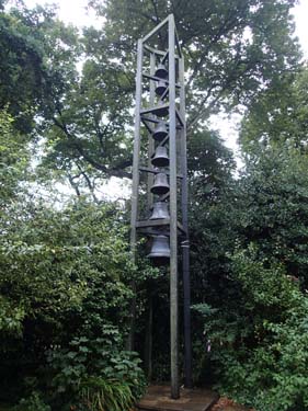Dagens sista logg blev vid ”Sneaky Town Series – Park of peace” vid en klockstapel. När jag närmade mig burken stod en man och såg förbryllad ut under klockorna, givetvis en burkjägare. Vi hälsade och det visade sig vara en tysk geocachare som inte verkade behärska speciellt mycket av det engelska språket. Han hade letat en stund utan att finna burken. Jag kunde ”glädja” honom med att snabbt plocka fram den!