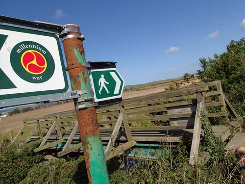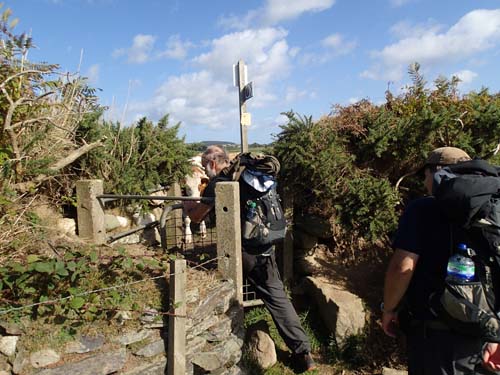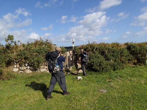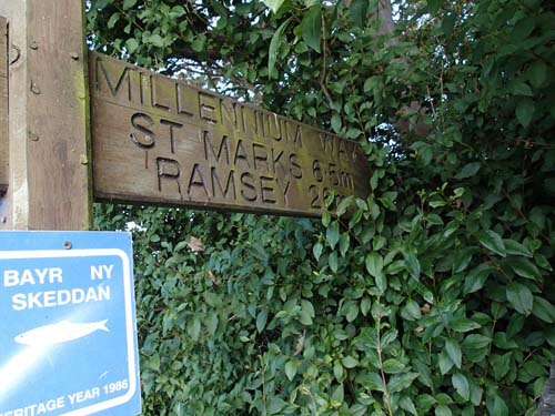 Strax efter denna mult nådde vi fram till det lilla samhället Crossby där öns två stora GC-leder korsar varandra. Vi lämnade då Millennium Way för att påbörja Heritage Power Trail vid nummer 52. Tidigare under vandringen var det ofta en kilometer mellan burkarna, på denna PT var det 161-200 meter mellan gömmorna, så vi fick ställa om blick och hastighet för att gå i riktning mot Peel.