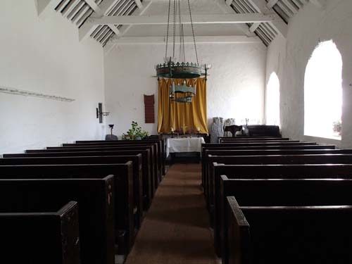 I fjärran såg vi nu de höjdområden som skulle bli föremål för morgondagens vandring, men ännu höll vi oss till låglandet och fick efter turen i beteshagarna gå en bit på landsvägen. Lite tristare etapp av turen men den kryddades av ett fint besök vid en kyrka från sent 1100-tal där det också fanns en multi.