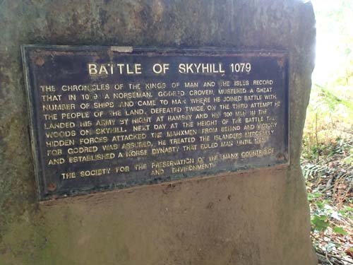 På stenen berättas följande; ”The chronicles of the kings of Man and the Isles record that in 1079 a Norseman Godred Croven, mustered a great number of ships and came to Man where he joined battle with the people of the land. Defeated twice, on the third attempt he landed his army by night at Ramsey and hid 300 men in the woods on Skyhill. Nex day at the height of the battle the hidden forces attacked the Manxmen from behind and victory for Godred was assured. He treated the islanders mercifully and established a Norse dynasty that rueld Man until 1265”.