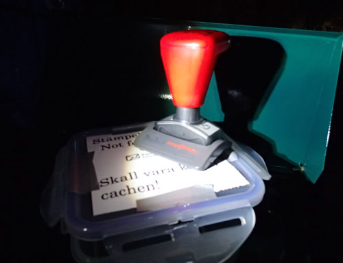 Jag övergick nu från rollen som jägare till rollen som CO och gick mot min egen cache ”Kapten Bertilssons Letterbox”. Jag renoverade cachen häromveckan men stämpel saknades och jag skulle frakta bort den gamla lådan dessutom. Med mig i ryggsäcken hade jag en riktigt fin stämpel, specialgjord för denna letterbox, jag hoppas att den får vara kvar i cachen och att ingen besökare lyckas förstöra även denna finallåda.