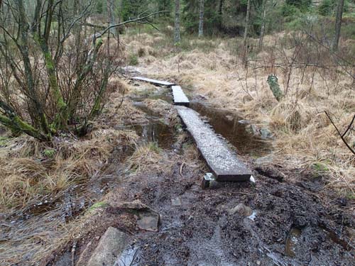 Omväxlande var det blött, isigt och ibland en kombination av båda! Om man inte hade för hög Hallén-fart gick det att ta sig över spängerna. Burk för burk loggades, för det mesta utan större problem. Vid ett par burkar fick jag ta till ”träpinneteknik” för att nå upp till cacherna.