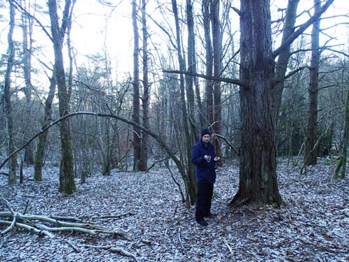 Under julaftonens eftermiddag började det snöa lätt – med betoning på lätt – kring cachingbasen men det hade inte orsakat någon halka så det var riktigt inbjudande att ge sig ut på en tur i minus fem grader denna soliga juldag. Det fanns inte utrymme för någon längre tur men någon burk i närområdet kunde hinnas med. Först gick jag mot ”ELENAZ” som publicerades några dagar för jul. Tyvärr låg den på en stor öppen gård, i ett lekredskap på en lekplats, jag kände mig iakttagen från de många fönster som omgav lekplatsen (trodde inte det var tillåtet numera att publicera cacher på lekplatser), utan någon givande hint gav jag snabbt upp och begav mig istället iväg mot skogen.