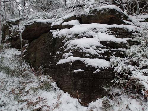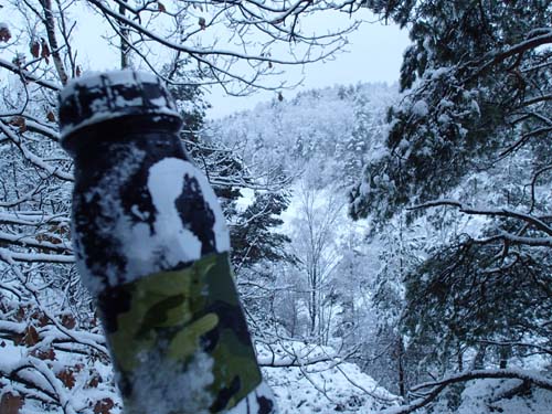 Jag gick vidare mot ”Ugglemossen runt – Rätvinklig” och inledde mitt sökande. Även här blev jag kvar länge och gav mig på en del klättrande i branterna som var nära att sluta illa, men jag behöll balans och hälsa och beslutade mig för att ge upp även denna burk. Kan det vara snön som gjort cacherna extra svåra att hitta?